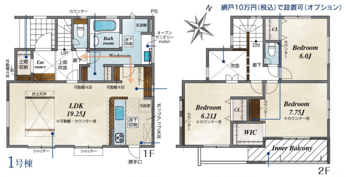 ☆南西角地 ☆土地面積155.11平米(約46.92坪) ☆建物面積106.34平米(約32.16坪)にインナーバルコニー部分5.79平米(約1.75坪)含みます。 ☆ベビーカーなどが収納できる可動棚付きの土間収納があり、玄関がスッキリします。 ☆玄関上部は吹き抜けになっていて、明るく開放感があります。 ☆キッチン横には、パントリーとしても利用できる、可動棚付きのカウンターあり ☆リビングは、開放感のある折上天井です。 ☆ゴミ出しなどに便利な勝手口があります。 ☆2階の全居室には読書などに便利なカウンターが設置されています。 ☆急な雨も安心なインナーバルコニー ☆ウォークインクローゼット含め、各居室に収納あり ☆並列2台可能(車種による)