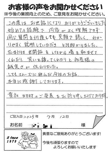 たまには 世間話をしながら場を和ませてくれたり、笑いを誘ってくれたりと社長様の誠実さが伝わりました。