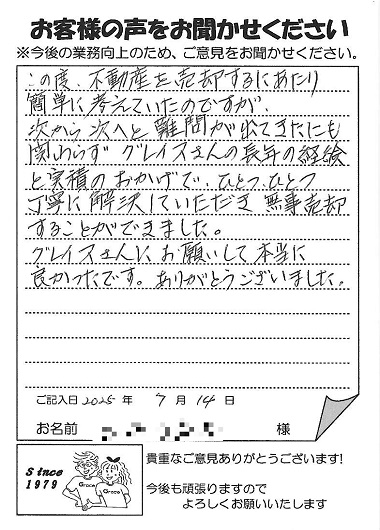 この度、不動産を売却するにあたり簡単に考えていたのですが、 次から次へと難問が出てきたにも関わらずグレイスさんの長年の経験と実績のおかげで、 ひとつ、ひとつ丁寧に解決していただき、無事売却することができました。