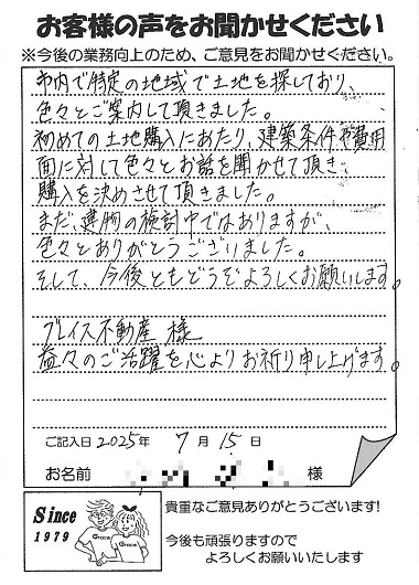 初めての土地購入にあたり、建築条件や費用面に対して色々とお話を聞かせて頂き、購入を決めさせて頂きました。