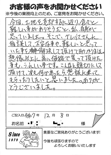 今回、土地を売却するに辺り、色々と難しい事がありそうだと、私自身が思っていました。 そこで、グレイスさんに相談して、不安な事や、難しいと思っていた事を解決して頂けて助かりました。