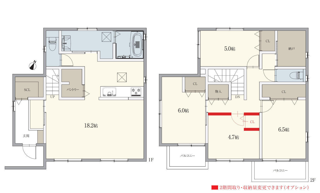 | 間取詳細 | (1階)LDK18.2、(1階)パントリー、(2階)洋6.5、(2階)洋6、(2階)洋5、(2階)4.7、(2階)納戸 |