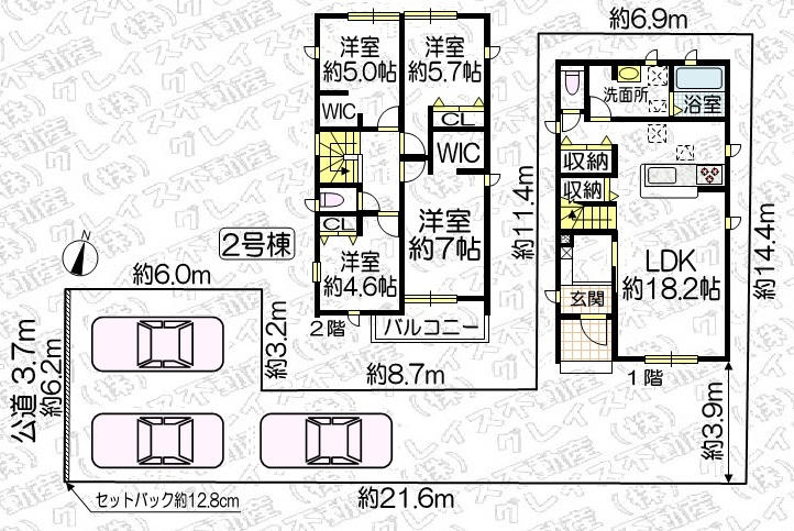 | 間取詳細 | (1階)LDK18.2、(2階)洋7、(2階)洋5.7、(2階)洋5、(2階)洋4.6、(2階)ウォークインクローゼット×2 |