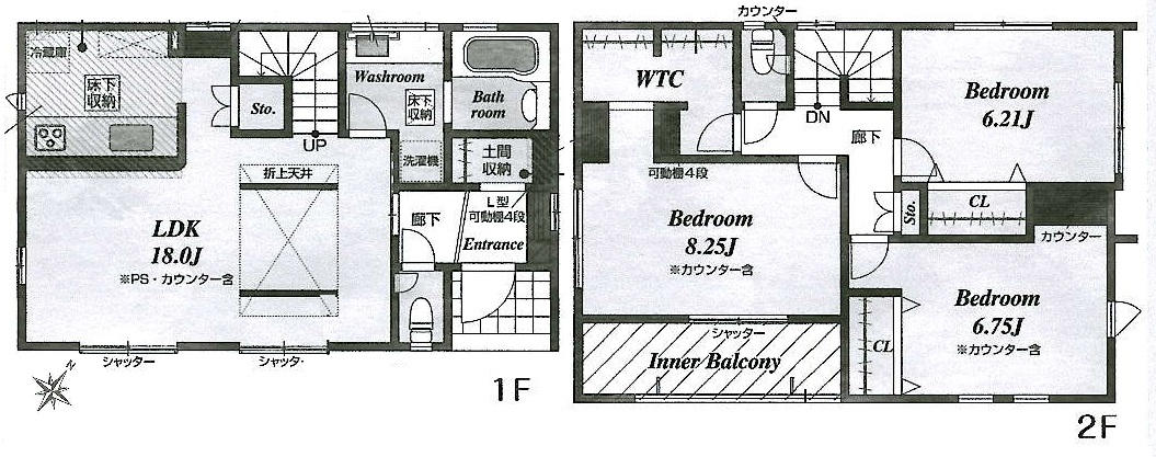 | 間取詳細 | (1階)LDK18.0、(2階)洋8.2、(2階)洋6.7、(2階)洋6.2、(2階)ウォークスルークローゼット |