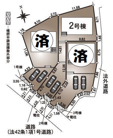 | 接道 | 南西 4.2m(幅員) 公道 5.3m(接面) 東 1.1m(幅員) 法定外道路(公道) 11.3m(接面) |