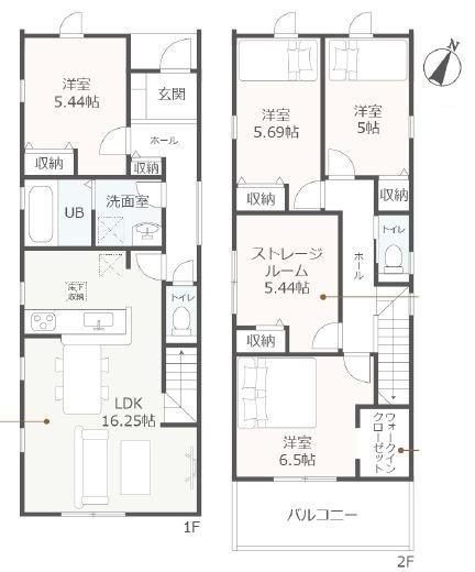 | 間取詳細 | (1階)LDK16.2、(1階)洋5.4、(2階)洋6.5、(2階)洋5.6、(2階)洋5、(2階)ストレージルーム5.4 |