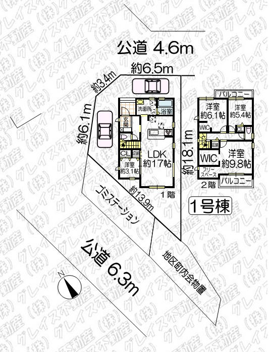 | 接道 | 北西 6.3m(幅員) 公道 6.1m(接面) 北東 4.6m(幅員) 公道 6.5m(接面) |