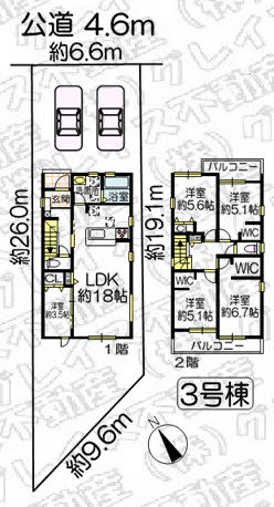 | 間取詳細 | (1階)LDK18、(1階)洋3.5、(2階)洋6.7、(2階)洋5.6、(2階)洋5.1、(2階)洋5.1、(2階)ウォークインクローゼット×3 |