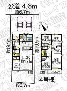 | 間取詳細 | (1階)LDK17、(1階)フリースペース3、(2階)洋7.5、(2階)洋5、(2階)洋5、(2階)洋4.2、(2階)洋4.2、(2階)WIC×3 |