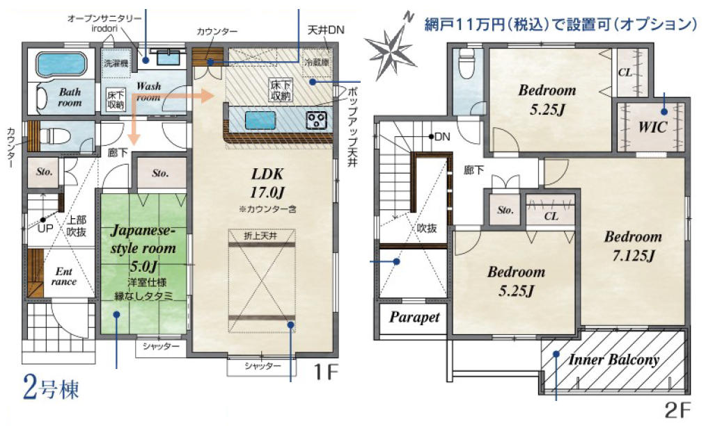 | 間取詳細 | (1階)LDK17、(1階)洋風和室5、(2階)洋7.1、(2階)洋5.2、(2階)洋5.2、(2階)ウォークインクローゼット |