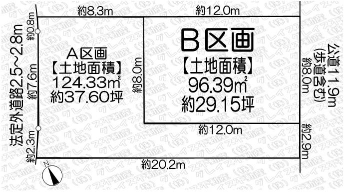 ※A区画・B区画、同時売却が条件となります。 ※確定測量後のお引渡しになります。測量の結果により分筆面積が多少増減する可能性があります。 ※古家がございますので、建物の解体費用がかかります。解体費用はA・B区画の買主様で折半になります。