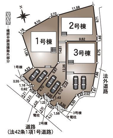 接道 | 南西 4.2m(幅員) 公道 5.3m(接面) 東 1.1m(幅員) 法定外道路(公道) 11.3m(接面) |