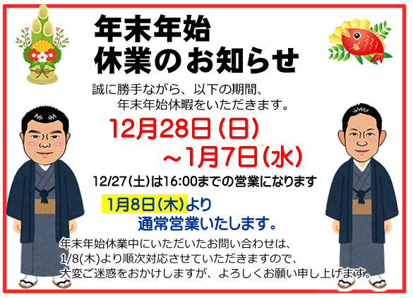 新年は、1月8日(木)より通常営業いたします。 なお、12月27日(土)の営業時間は 16:00までになります。