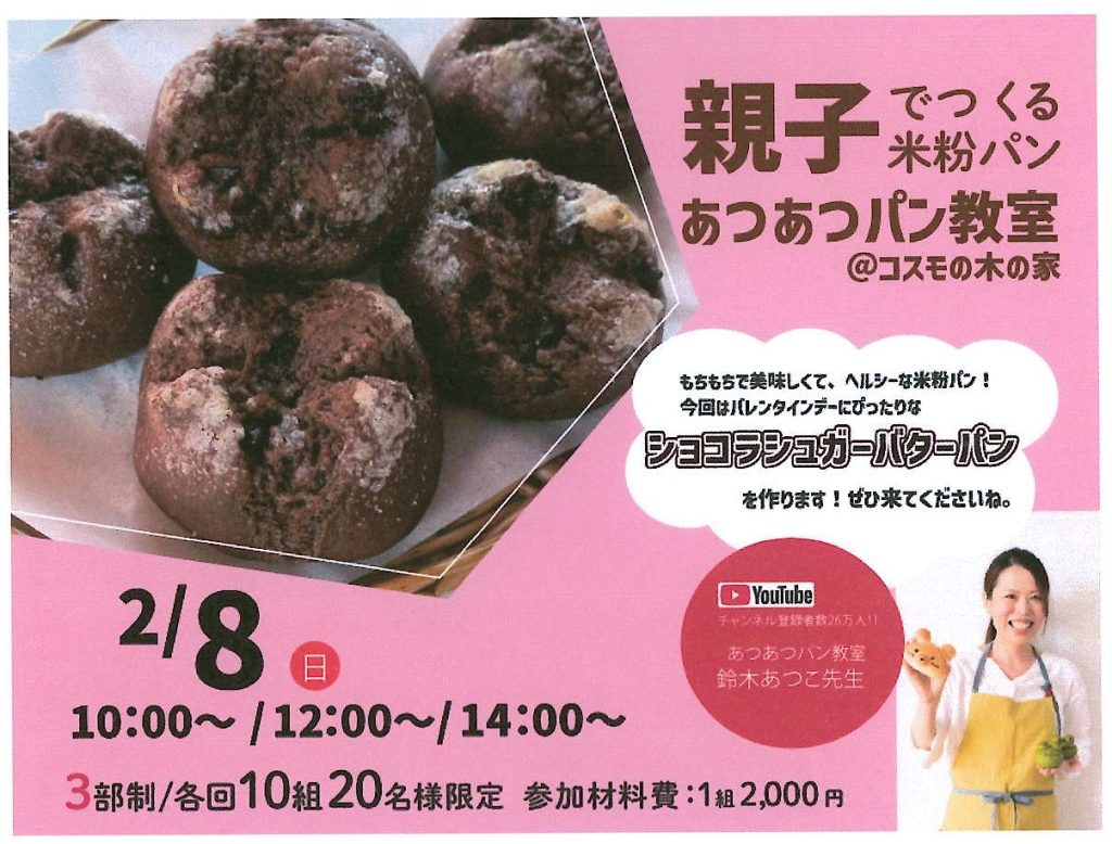 2月8日(日)に、豊明市栄町にあるコスモの木の家さんで「親子でつくる米粉パン あつあつパン教室」が開催されます。