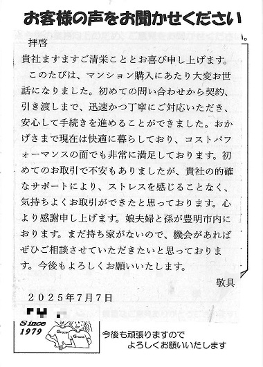 娘夫婦と孫が豊明市内におります。まだ持ち家がないので、機会があればぜひご相談させていただきたいと思っております。今後もよろしくお願いいたします。