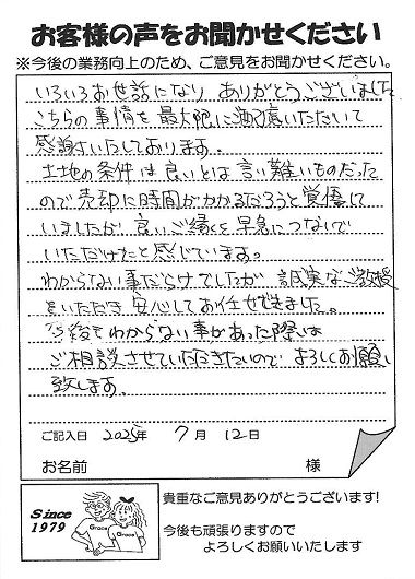 土地の条件は良いとは言い難いものだったので売却に時間がかかるだろうと覚悟していましたが、 良いご縁を早急につないでいただけたと感じています。