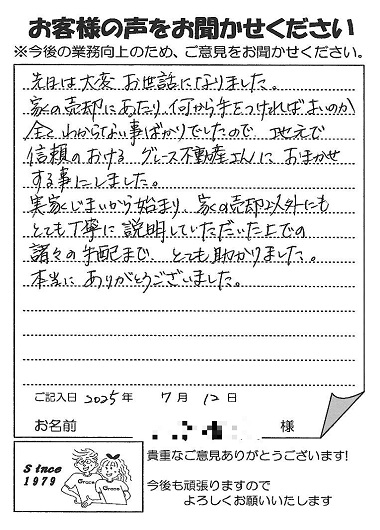 家の売却にあたり、何から手をつければよいのか全くわからない事ばかりでしたので、 地元で信頼のおけるグレース不動産さんにおまかせする事にしました。