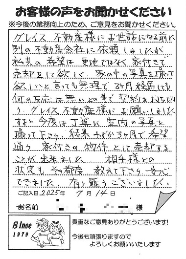 グレイス不動産様にお世話になる前に別の不動産会社に依頼しましたが 私共の希望は更地ではなく家付きで売却をして欲しく、 家の中の写真を撮って欲しいと言っても無理で3ヶ月経過しても何の反応は無いとの事で契約を打ち切り、 グレイス不動産様にお願いしました。
