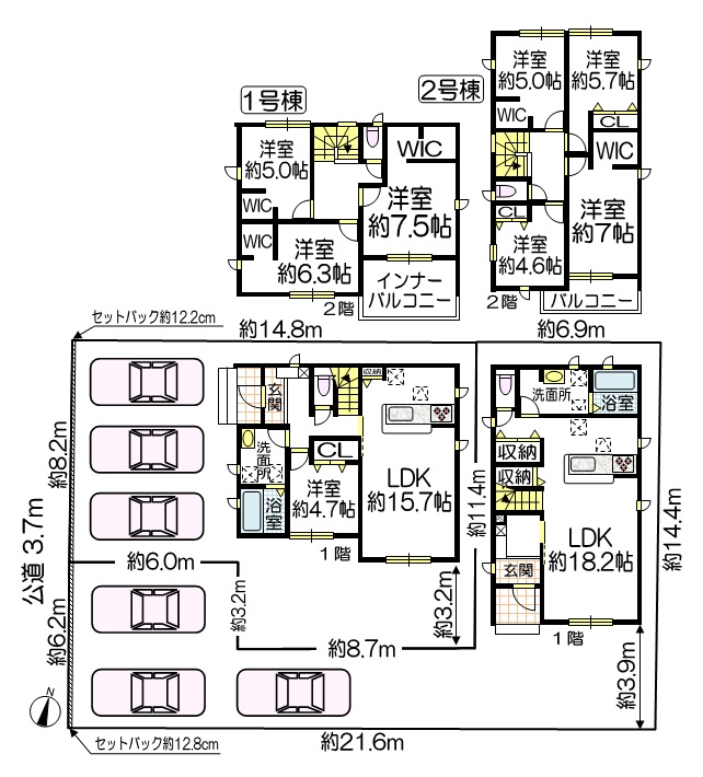 2号棟は建物が奥まっている、いわゆる延長敷地(旗竿地)になりますが、2台並列駐車可能です。